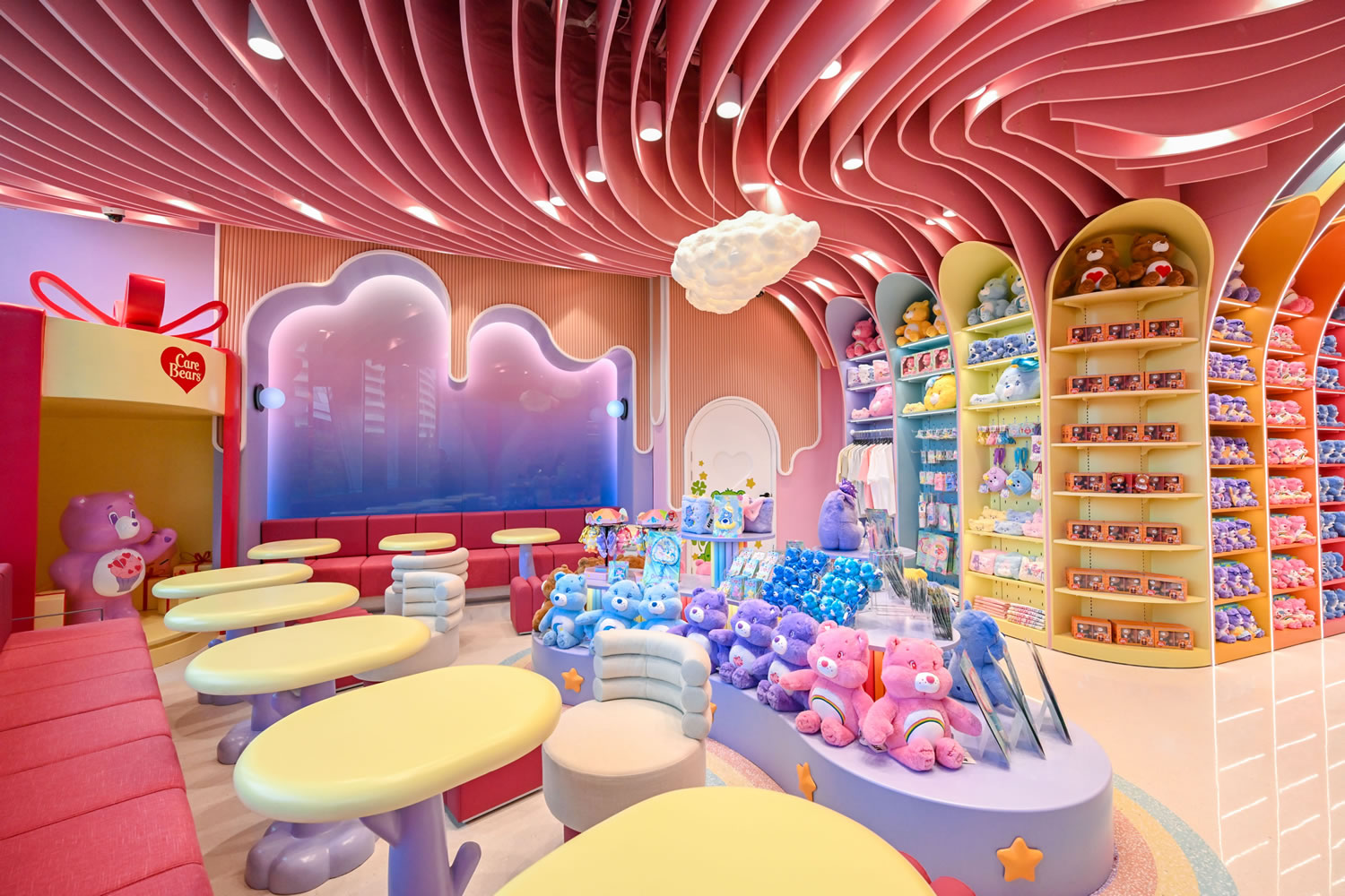 Care Bears主題咖啡店位于cdf三亞國(guó)際免稅城C區(qū)二層,以“治愈系空間”為核心設(shè)計(jì)理念,整體裝修風(fēng)格延續(xù)了品牌標(biāo)志性的彩色風(fēng)格與柔和線條,店內(nèi)墻面裝飾經(jīng)典小熊插畫,展陳小熊玩偶,并將IP元素深度融入飲品和甜品設(shè)計(jì)。