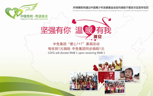 4月20日,四川雅安發(fā)生7.0級(jí)地震,突如其來(lái)的災(zāi)難牽動(dòng)著無(wú)數(shù)中國(guó)人的心。地震發(fā)生后,各大企業(yè)、社會(huì)組織、各地民眾紛紛行動(dòng)了起來(lái),通過(guò)各種方式給災(zāi)區(qū)予以最大的關(guān)注和支援。作為免稅行業(yè)標(biāo)桿企業(yè),中國(guó)免稅品(集團(tuán))有限責(zé)任公司(以下簡(jiǎn)稱(chēng)中免集團(tuán))在繼汶川、玉樹(shù)地震捐助后,再次攜手中國(guó)青少年發(fā)展基金會(huì),發(fā)起“愛(ài)心1+1”雅安救災(zāi)助學(xué)捐助倡議,向雅安地震災(zāi)區(qū)孩子們獻(xiàn)出一份愛(ài)心,幫助他們?cè)缛兆叱鰹?zāi)難陰霾,重建家園。