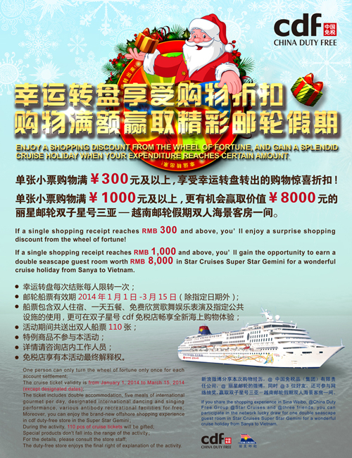 圣誕元旦臨近,旅游價(jià)格相對(duì)平穩(wěn)、上班族集中休假等因素使得今年雙節(jié)旅游市場(chǎng)再次迎來出游小高峰。其中不少公司白領(lǐng)將春節(jié)出境游計(jì)劃提前,選擇性價(jià)比更高的錯(cuò)峰出游。各大商家的年終促銷活動(dòng)讓節(jié)日提前升溫,2013年12月15日-2014年1月5日期間,中國(guó)免稅品(集團(tuán))有限責(zé)任公司(以下簡(jiǎn)稱中免集團(tuán))旗下十家免稅店聯(lián)合推出“幸運(yùn)轉(zhuǎn)出來&幸運(yùn)秀出來”年終主題促銷活動(dòng),貼心的購(gòu)物折扣以及價(jià)值約百萬元的麗星郵輪船票大獎(jiǎng),為雙節(jié)出境游客送上別樣驚喜。