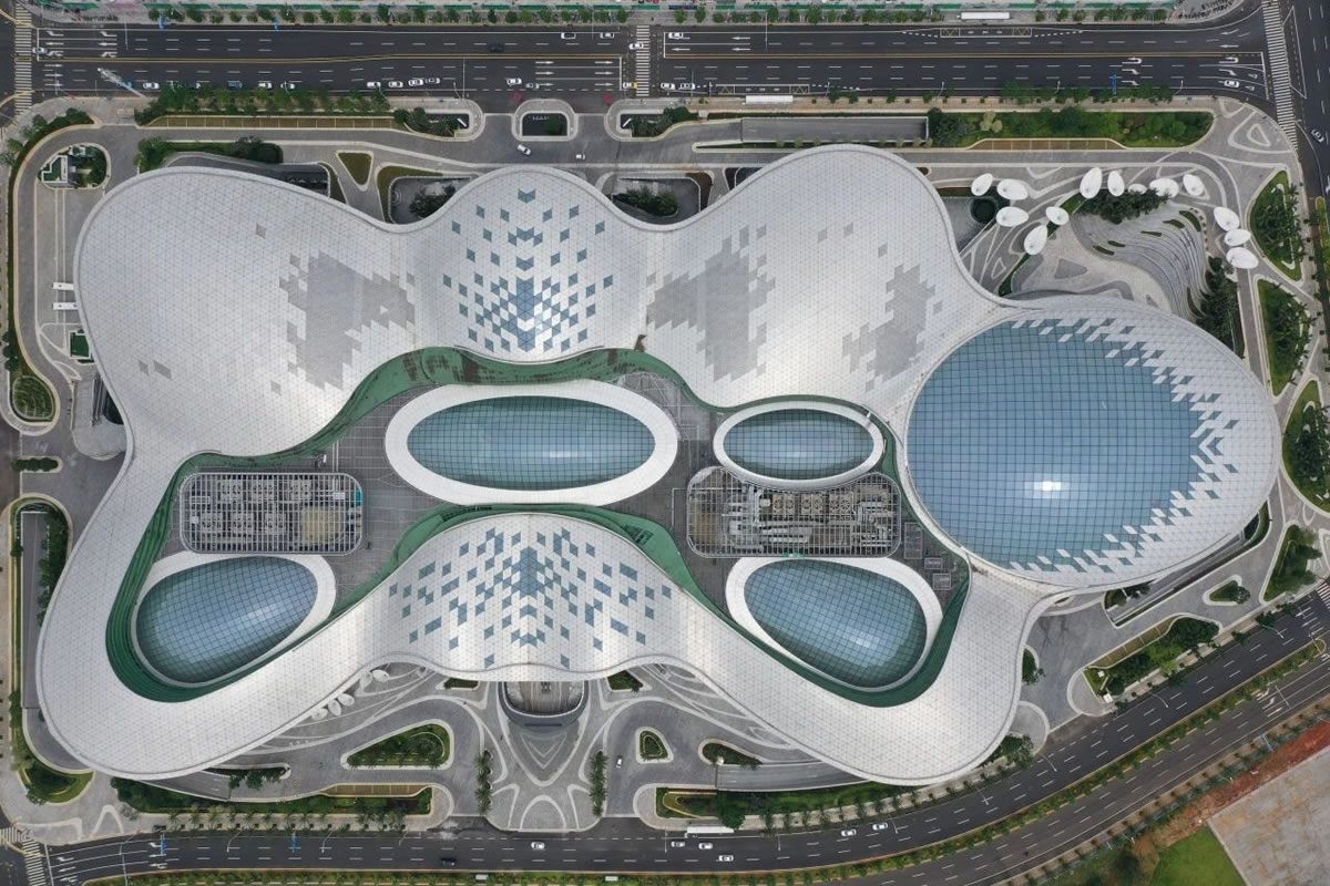 ▲海口國(guó)際免稅城項(xiàng)目“AURA天際秘林”中庭(攝于調(diào)試階段)