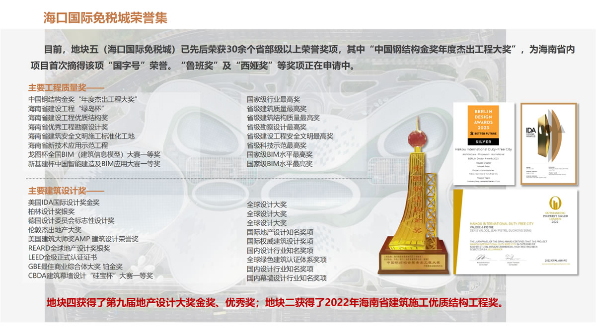 ▲ ??趪?guó)際免稅城項(xiàng)目整體建設(shè)所獲榮譽(yù)