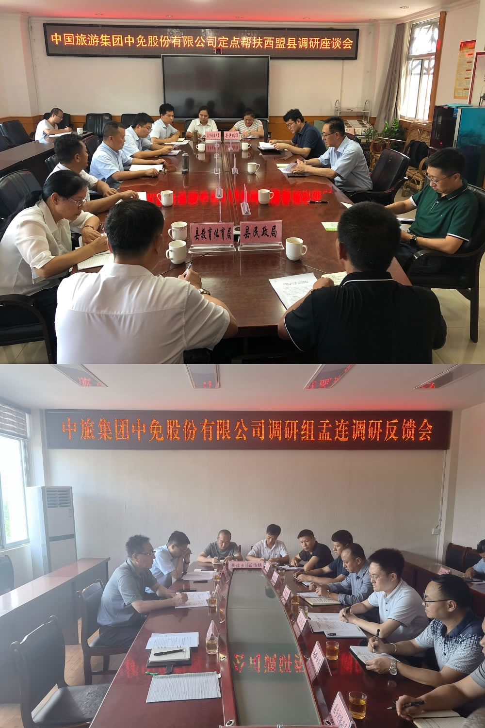 2021年7月6日至9日,中旅免稅黨委書記、董事長彭輝、黨委副書記王月浩一行赴云南省孟連縣、西盟縣開展幫扶工作調(diào)研,重點調(diào)研中旅免稅2021年擬在兩個縣開展的旅游主業(yè)幫扶、特色產(chǎn)業(yè)幫扶、教育幫扶等相關(guān)工作,并召開座談會,就2021年孟連縣、西盟縣持續(xù)抓好鞏固脫貧攻堅成果接續(xù)鄉(xiāng)村振興工作與兩縣縣委、縣政府進(jìn)行深入交流。