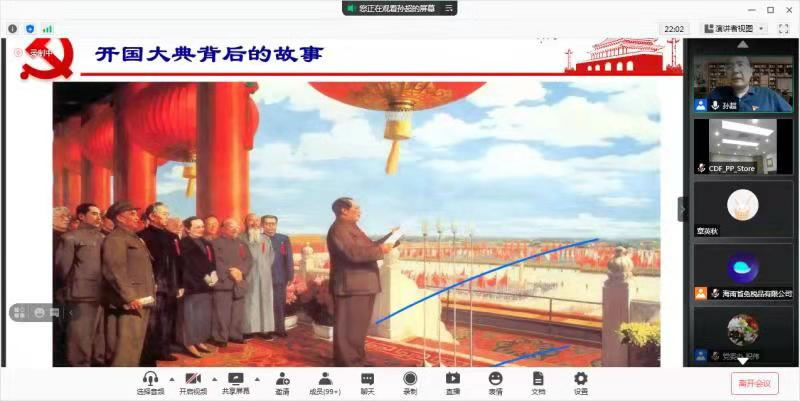 2021年5月27日,中旅免稅黨委舉辦第三期“黨史大講堂”專題培訓(xùn)。根據(jù)中旅免稅黨委“黨史大講堂”培訓(xùn)工作安排,此次活動(dòng)由海南省免稅品有限公司黨委組織承辦,海南省免稅品有限公司黨委班子成員和機(jī)關(guān)黨支部全體黨員在會(huì)議室集中參加線上培訓(xùn),中旅免稅其他各級(jí)黨組織黨員和入黨積極分子共600余人通過視頻方式線上參會(huì)。